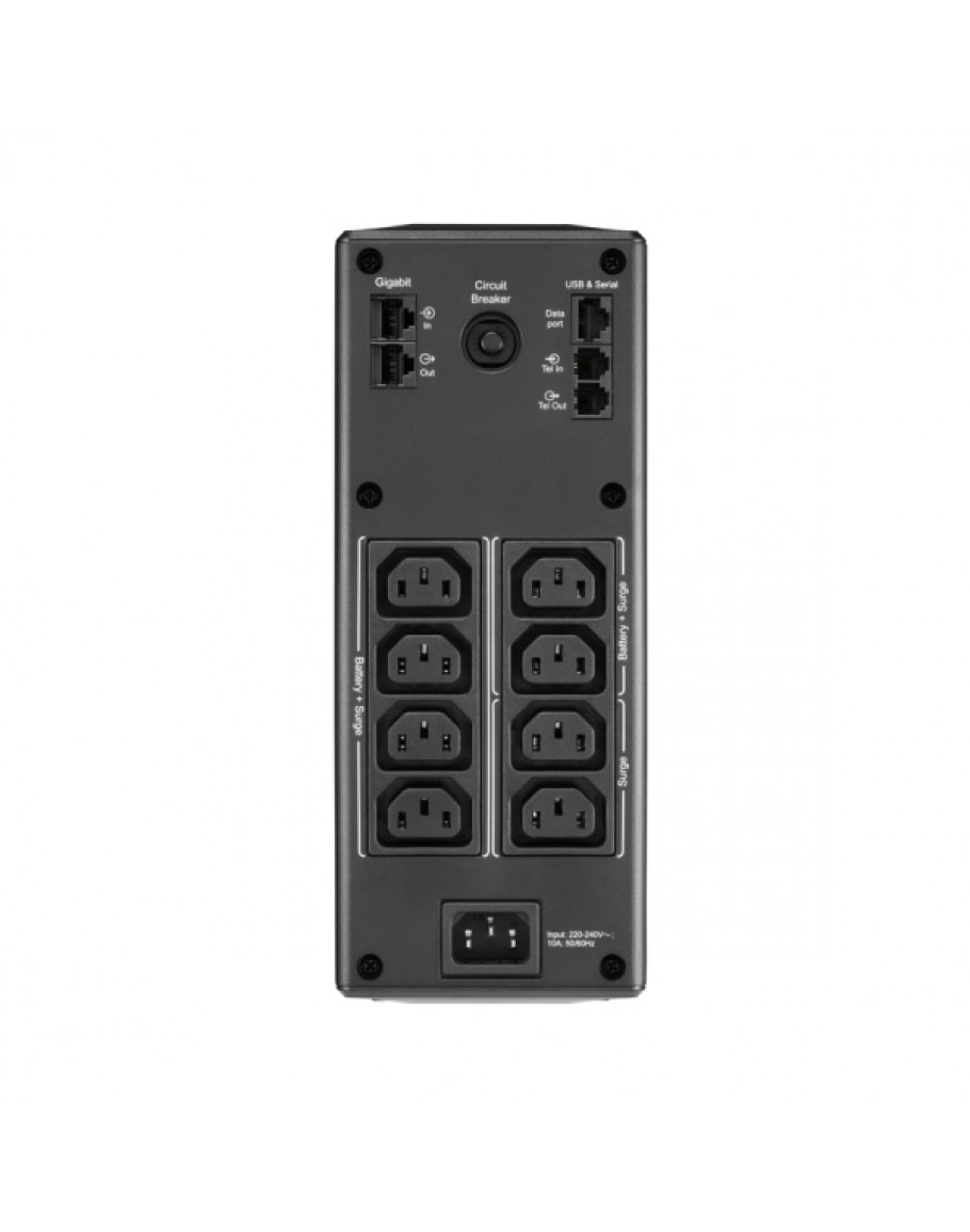 | Защити | 1 Gb Dataline protection; Overload Protection: On line: 10A circuit breaker, with overload warning capability; On battery: internal current limit to overload alarm/shutdown; Surge Protection | |