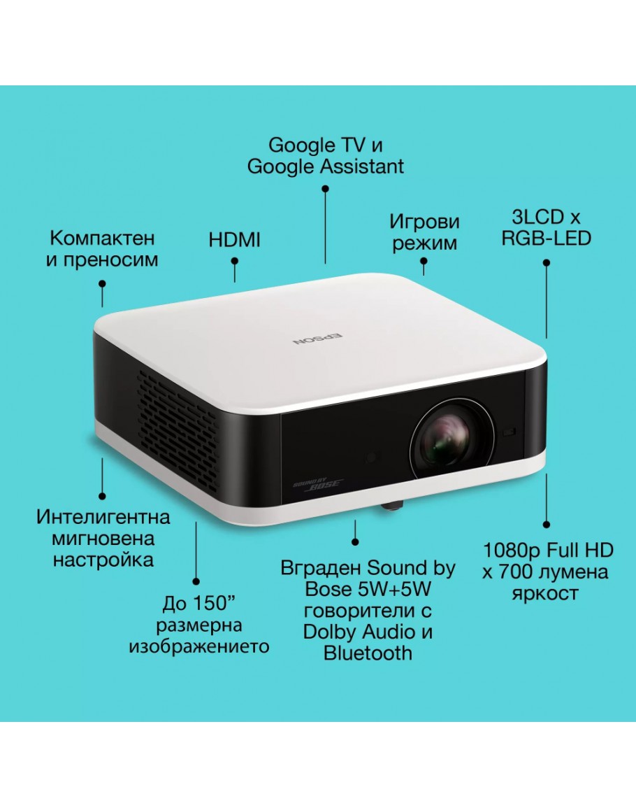| Други | Google TV and Google Assistant, Auto power on, Auto shape correction, Auto source search, Auto keystone correction, Built-in speaker, Chromecast, Digital zoom, Fit to Screen, Frame-Interpolation, Game mode, Google TV, Quick Corner, Screen fit, 2D Colour M |