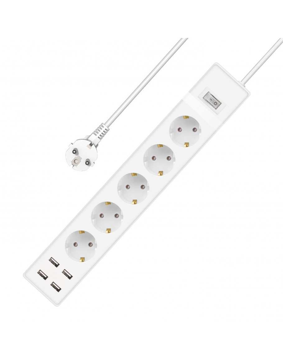 Удължител No brand, 5 гнезда, 250V, 16A, Кабел, 3m, 4 x USB F, С ключ, Бял - 17890
