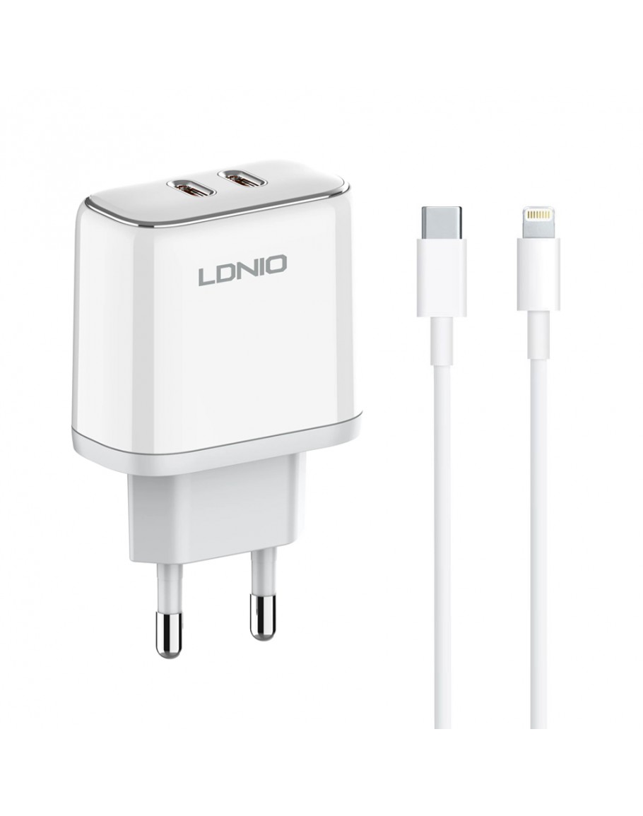 Мрежово зарядно устройство LDNIO A2528M, MFi, 35W, 2 x Type-C F, PD, С Кабел Type-C към Lightning, Бял - 40280