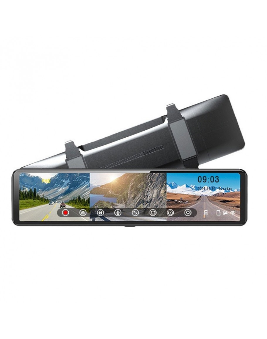 Функционален видеорегистратор огледало за автомобил, който съчетава функционалността на огледалото за обратно виждане с възможностите за запис на камера.Оборудван с голям 12-инчов екран, той осигурява кристално чисти изображения както от предната, така и от вътрешната и задната камера, с разделителна способност съответно от 1280x720P, 640x480P и 640x480P/30fps. Подобрявайки цялостната видимост, включените широкоъгълни лещи (120°/90°/90°) осигуряват широко зрително поле, което ви позволява да наблюдавате всичко около вас по време на шофиране.